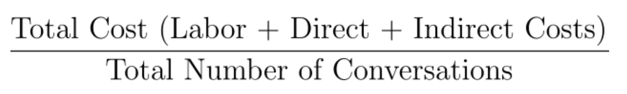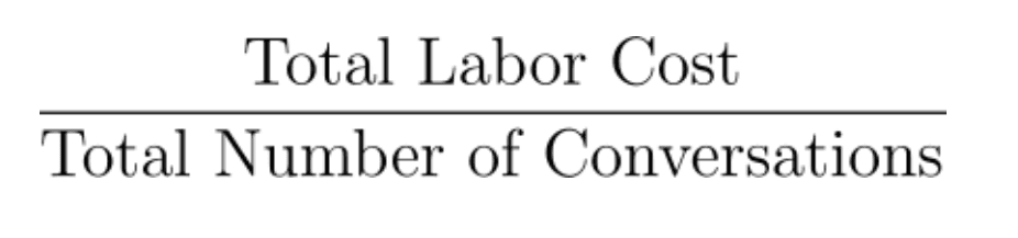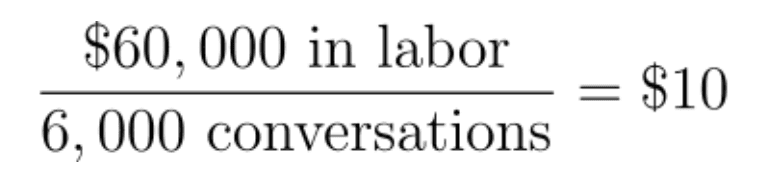 If the total labor cost for a quarter (3 months) is $60,000 and the number of conversations handled is 6,000, the CPC is $10: